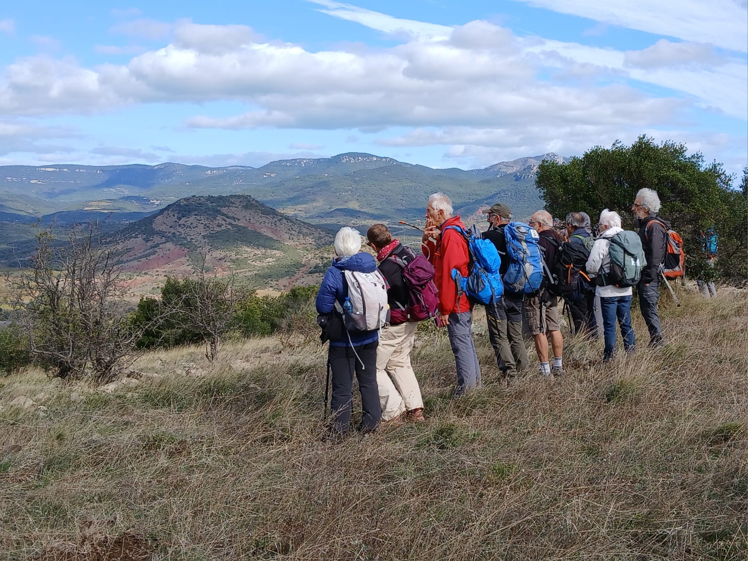 Martine animera cette boucle et Laurent se postera au rôle de serre fil, talkies à la main au cas où il y a erreur de mauvaise direction. Nous commençons par un petit tour du village, afin de découvrir ses vieilles maisons en pierre de lave. Il fait beau, un peu de vent et nous partons en direction des balcons du Salagou par un chemin parfois caillouteux ou boisé. Les couleurs sont vraiment magnifiques. Le temps est clair et nous découvrons des panoramas sur la plaine, le mont saint-Baudille. Un passage de "bartasse" hors sentier demande toute mon attention, pour bien diriger le groupe sans crainte de perdre un ou deux randonneurs. Ouf je m’en sors bien et voici la vue sur le barrage du Salagou.